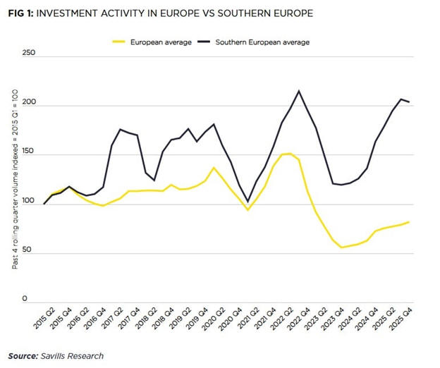 Η Ελλάδα καταγράφεται ως η χώρα με τη μεγαλύτερη αύξηση στις επενδύσεις real estate στην Ευρώπη, σύμφωνα με την Savills, καθώς ο όγκος συναλλαγών ενισχύθηκε κατά 58% το 2025. Ο ξενοδοχειακός κλάδος παραμένει ο βασικός μοχλός ανάπτυξης, ενώ συνολικά ο ευρωπαϊκός Νότος συνεχίζει να υπεραποδίδει, έστω και με πιο εξομαλυμένους ρυθμούς, χάρη σε διαρθρωτικά πλεονεκτήματα που τον έχουν τοποθετήσει σταθερά στο επίκεντρο του επενδυτικού ενδιαφέροντος.