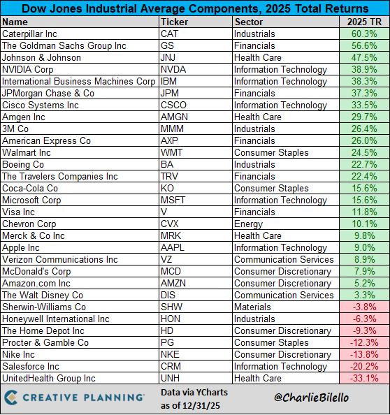 23 out of the 30 stocks in the Dow finished up in 2025 with Caterpillar leading the way with a gain of +60%.