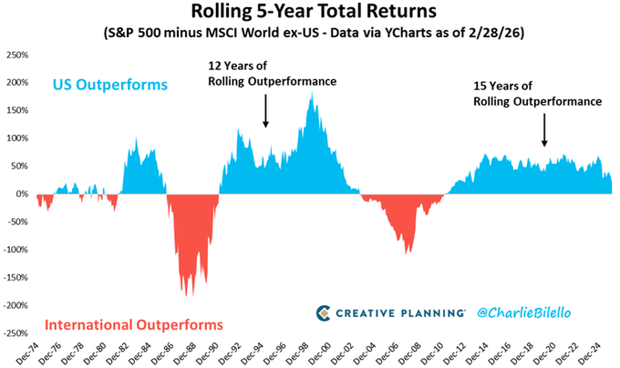 δείχνει ότι οι περίοδοι υπεραπόδοσης μεταξύ ΗΠΑ και διεθνών