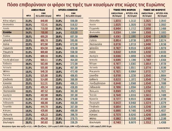 ευρώ/λίτρο) κατατάσσει την Ελλάδα στις ακριβές αγορές και