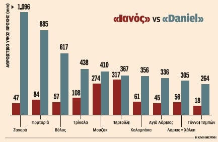 Ελάτε τώρα να δούμε με νηφαλιότητα τι έγινε. Το διάγραμμα προέρχεται από το Εθνικό Αστεροσκοπείο και συγκρίνει τη βροχόπτωση σε διάφορες περιοχές μεταξύ του «Ιανού» και του «Daniel». Στη Ζαγορά έριξε 23 φορές περισσότερο νερό από ό,τι στον «Ιανό». Θυμίζω ότι ο «Ιανός» ήταν επίσης καταστροφικός με πλημμύρες στην περιοχή. Στον Βόλο 11 φορές περισσότερο και στην Πορταριά 10 φορές περισσότερο νερό. Οποιος ισχυρίζεται ότι με την εμπειρία του «Ιανού» έπρεπε να σχεδιάσουμε αντιπλημμυρικά έργα που να αντέχουν τα μεγέθη του «Daniel», λυπάμαι που θα το πω άκομψα, αλλά δεν ξέρει τι του γίνεται.