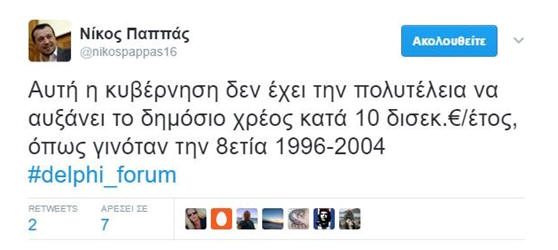 Μια μέρα πριν ο υπουργός Νίκος Παππάς έγραφε στο Twitter: «Αυτή η κυβέρνηση δεν έχει την πολυτέλεια να αυξάνει το δημόσιο χρέος κατά 10 δισεκ.€/έτος, όπως γινόταν την 8ετία 1996-2004». Σύμφωνα με τα στοιχεία της Eurostat, τα οποία έχει αποδεχτεί χωρίς καμία αμφισβήτηση η κυβέρνηση ΣΥΡΙΖΑ-ΑΝΕΛ, το χρέος ανέβηκε κατά 120 δισ. ευρώ μέσα στην πενταετία 2004-2009, ήτοι 24 δισ. το χρόνο. Ο υπουργός πηγαίνει στην περίοδο Σημίτη, ξεπερνώντας την περίοδο Καραμανλή. Πέρα από την προφανή ποσοτική διαφορά του μεγέθους της αύξησης του χρέους ανάμεσα στις δύο περιόδους, υπάρχει μια πολύ σημαντική ποιοτική διαφορά. Την περίοδο Σημίτη υπήρχαν για επτά χρόνια μεγάλα πρωτογενή πλεονάσματα. Πράγμα που σημαίνει ότι το κράτος είχε πλεόνασμα από την ετήσια διαχείριση των οικονομικών του και του περίσσευαν χρήματα για να πληρώνει τόκους παλαιών δανείων. Επειδή όμως, και εξαιτίας των υψηλών επιτοκίων της εποχής, το περίσσευμα δεν έφτανε για να πληρωθούν όλοι οι τόκοι, το υπόλοιπο καλυπτόταν από νέο δανεισμό και αυξανόταν το χρέος.