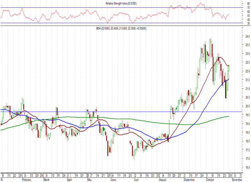 Σημαντική πτώση χθες για τη μετοχή της Motor Oil (20,90 ευρώ, -4,57%), η οποία μάλιστα κατά τη διάρκεια της ημέρας βρέθηκε να καταγράφει απώλειες ακόμη μεγαλύτερες (20,35 ευρώ, περίπου -8%). Και το πιο ανησυχητικό είναι πως η μετοχή επέστρεψε με ευκολία χαμηλότερα των 21,40 – 21,50 ευρώ (η επιστροφή υψηλότερα τους είναι ο στόχος σε αυτή τη φάση, έτσι ώστε να ηρεμήσει και πάλι η εικόνα). Σημειώνεται πως όσο η μετοχή μένει χαμηλότερα των προαναφερθέντων επιπέδων, αυξάνεται ο κίνδυνος η πτώση να συνεχιστεί μέχρι τα επίπεδα των 20 και πιθανόν 19,40 – 19,50 ευρώ, όπου είναι οι επόμενες πολύ ισχυρές στηρίξεις.