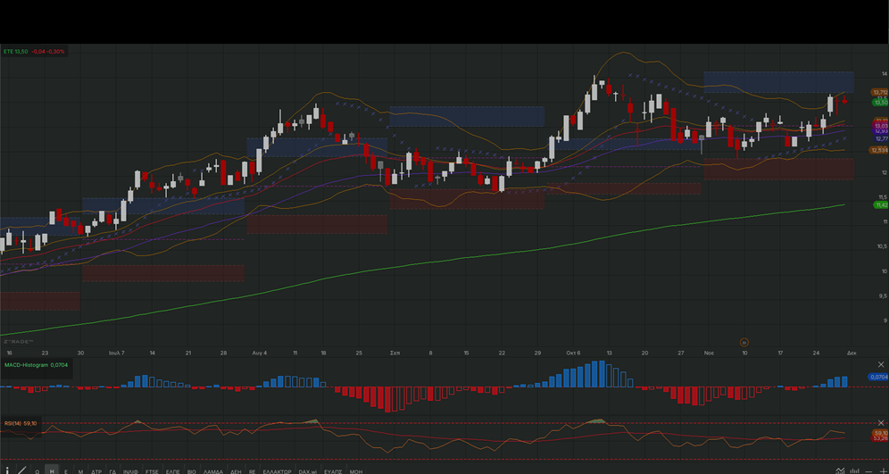 αντιστάσεις στα 13,40 – 13,50 ευρώ, με τη μετοχή ήδη στο άνω