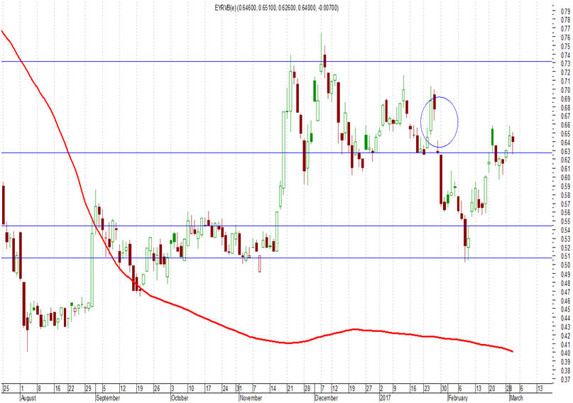 0,635 – 0,64 ευρώ (κλείσιμο 0,64 ευρώ, -1,08%) και εν συνεχεία να