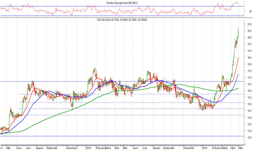 ΟΛΠ, με κλείσιμο στα 21,50 ευρώ, +3,86%, με τη μετοχή από