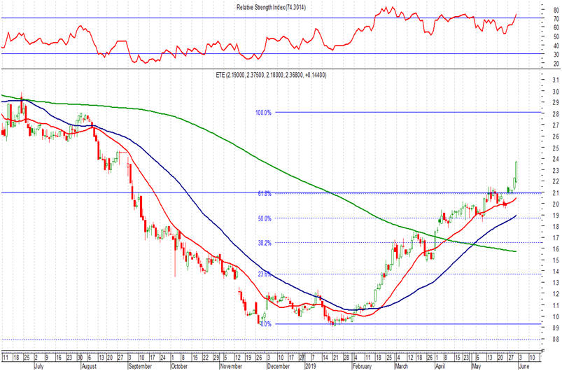 Στα 2,40 ευρώ (+1,35%) έκλεισε χθες η μετοχή της ΕΤΕ, με τη