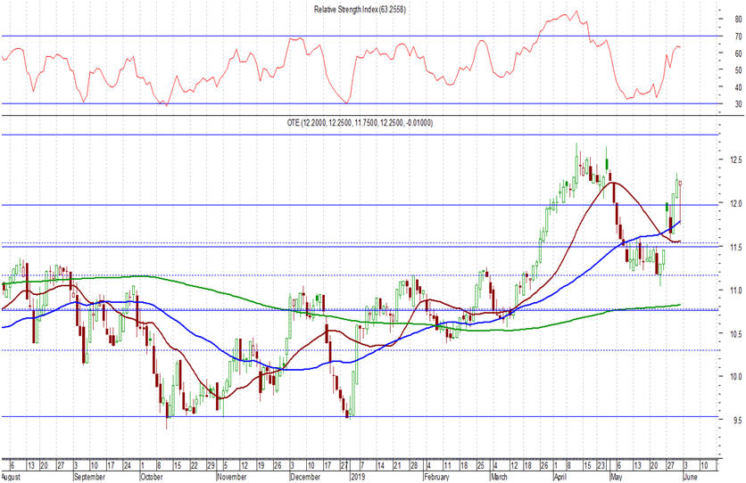 Στα 12,46 ευρώ, +1,71%, έκλεισε χθες ο ΟΤΕ. Διαγραμματικά εδώ το ζητούμενο είναι μια