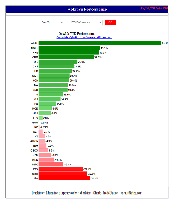 παρουσιάζονται οι αποδόσεις που είχανε οι 30 μετοχές του Dow