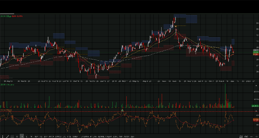 Στα 29,35 ευρώ, -0,14% έκλεισε χθες η ΕΕΕ. Και με τη μετοχή να είναι αρκετά ευμετάβλητη κατά το τελευταίο χρονικό διάστημα. Και υπάρχει μεγάλη ανάγκη να παραμείνει υψηλότερα των 29,00 – 29,10 ευρώ. Απώλεια αυτών των ισχυρών στηρίξεων, θα επιδεινώσει την εικόνα, με περιθώρια πτώσης, τουλάχιστον μέχρι τις στηρίξεις στα 27,00 – 27,20 ευρώ.
