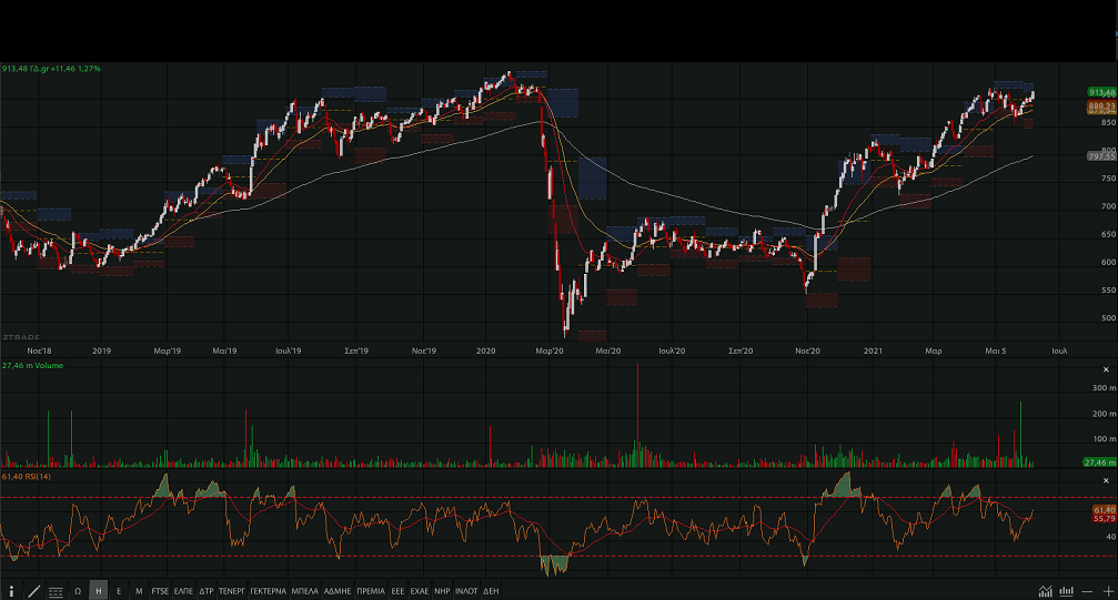 την αγορά να κλείνει στο υψηλό ημέρας (913,48 μονάδες,