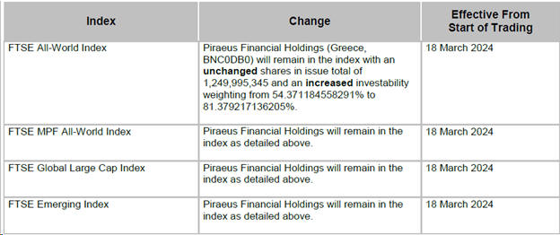 της Πειραιώς στους δείκτες του FTSE Russell.