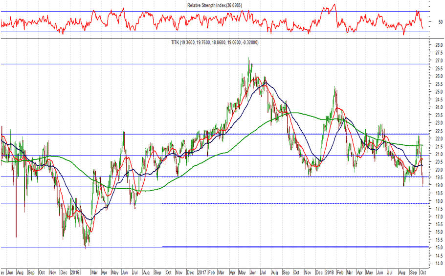 Στα 18,98 ευρώ (-0,42%) έκλεισε χθες η μετοχή του Τιτάνα, με τη διαγραμματική εικόνα να είναι πλήρως αρνητική και τη μετοχή να παλεύει να κρατήσει, τουλάχιστον τις στηρίξεις στα τρέχοντα επίπεδα των 18,80 – 18,90 ευρώ και με βάση αυτήν την παραμονή, η μετοχή να επιστρέψει υψηλότερα και των 19,50 – 19,60 ευρώ για να αρχίσει να ηρεμεί η διαγραμματική εικόνα. Σε διαφορετική περίπτωση και μετά από απώλεια των 18,80 ευρώ, το πιθανότερο είναι πως η πτώση θα συνεχιστεί μέχρι τις εξαιρετικά ισχυρές στηρίξεις στα επίπεδα των 18,70 – 18,80 ευρώ.