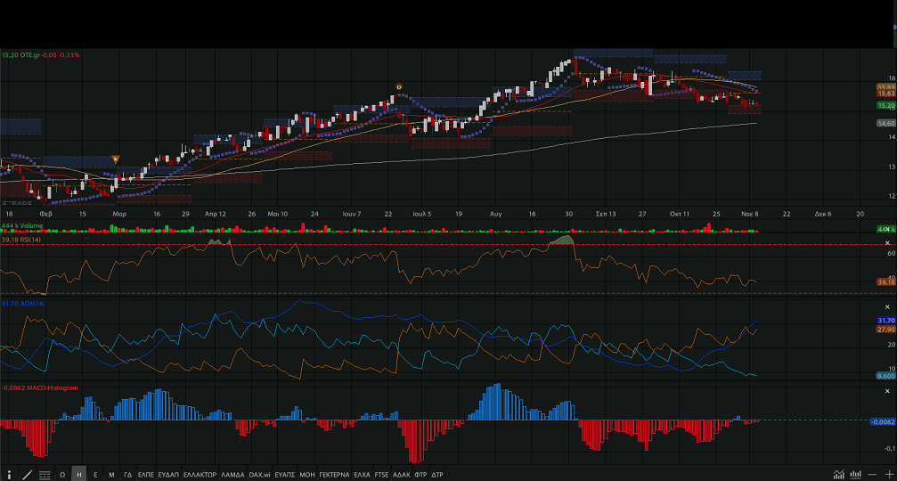 Στα 15,20 ευρώ έκλεισε χθες ο ΟΤΕ, με πτώση 0,33% και αν και