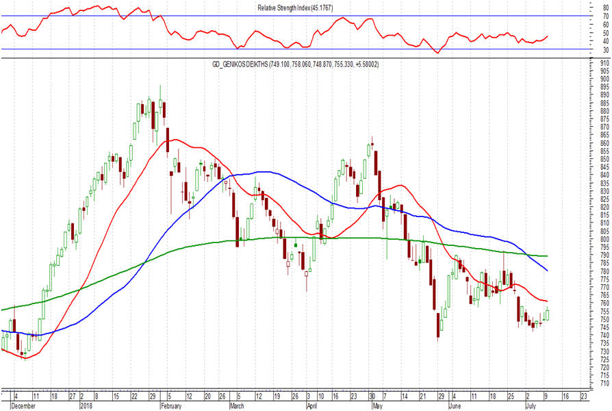 Με πτώση, σε μια κατά μέσο όρο κακή ημέρα για τις διεθνείς αγορές έκλεισε χθες το Χ.Α. (στις 746,70 μονάδες, -1,14%), με πιο μεγάλο τζίρο (37εκ ευρώ) σε σχέση με τις τελευταίες ημέρες και την αγορά να συνεχίζει να προβληματίζει. Και θα επαναλάβουμε πως αν και το πιθανότερο σενάριο είναι η αγορά να συνεχίσει να είναι υποτονική και να κινείται σε ένα σχετικά στενό εύρος τιμών μέχρι τα τέλη του καλοκαιριού (πιθανόν και Σεπτέμβριο), το ότι ο δείκτης μένει χαμηλότερα των 760 μονάδων αυτό δεν είναι καθόλου καλό. Για την ακρίβεια είναι άκρως ανησυχητικό, αφού όσο η αγορά μένει χαμηλότερα αυτού του επιπέδου υπάρχει κίνδυνος ανά πάσα στιγμή να φύγουμε σημαντικά χαμηλότερα.