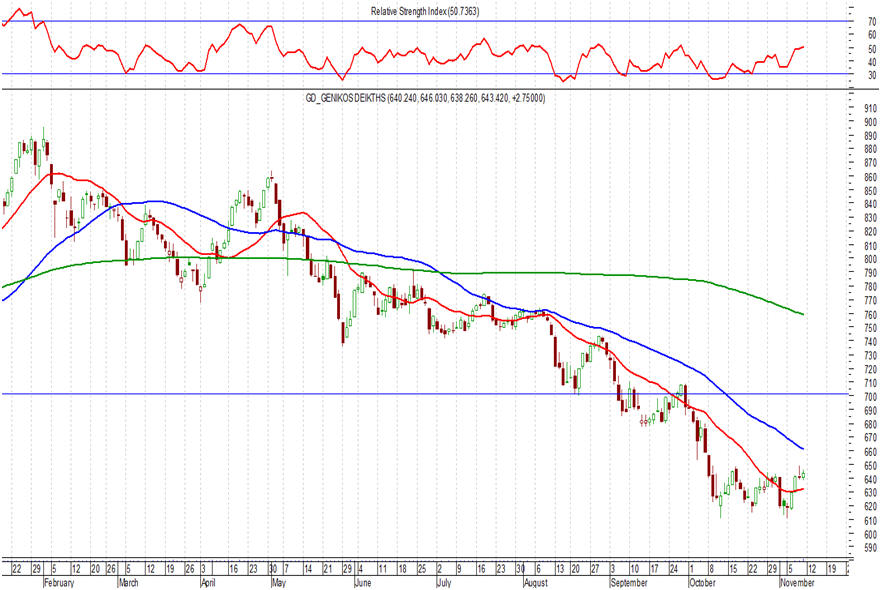 Στη «μάχη» με τις 640 – 650 μονάδες θα είναι στραμμένα όλα τα βλέμματα (κλείσιμο Παρασκευής 643,42 μονάδες, +0,43%), νιώθοντας πως αυτήν την φορά. Και μετά από 3 φορές που τις τελευταίες εβδομάδες η αγορά έκανε την κίνηση 610 - 640 μονάδες. Υπάρχουν περισσότερες πιθανότητες να διασπαστούν οι ισχυρές αντιστάσεις και να μιλήσουμε μετά από καιρό για μια πρώτη βελτίωση, της αρνητικής μέχρι νεοτέρας διαγραμματικής εικόνας. Για την ιστορία επόμενοι στόχοι, οι αντιστάσεις στις 660 – 665 μονάδες και 700  - 710 μονάδες, με ειδικά τα τελευταία αυτά επίπεδα να είναι μεγάλης σημασίας για τη μακροπρόθεσμη τάση (πολύ θα θέλαμε να δούμε επιστροφή της αγοράς υψηλότερα τους, μέχρι το τέλος της χρονιάς).
