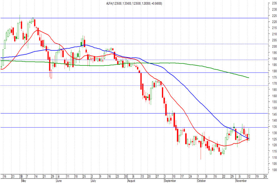 Και σε σύντομο σχόλιο τώρα για την Alpha Bank, η οποία χθες έκλεισε στα 1,283 ευρώ (+3,89%), μακριά από το υψηλό ημέρας 1,334 ευρώ.  Κλειδί για τη μετοχή η παραμονή υψηλότερα των διπλών σημαντικών τεχνικών επιπέδων των 1,24 – 1,25 ευρώ. Μια τέτοια παραμονή είναι σημαντική για τη βελτίωση της διαγραμματικής εικόνας. Και με βάση αυτήν, η μετοχή μπορεί να κάνει την υπέρβαση, με επόμενο στόχο τις αντιστάσεις στα επίπεδα των 1,45 – 1,46 ευρώ. Και κάπου εκεί ανοίγει η όρεξη, με προσδοκίες ανόδου μέχρι τις αντιστάσεις στα επίπεδα των 1,67 – 1,69 ευρώ.