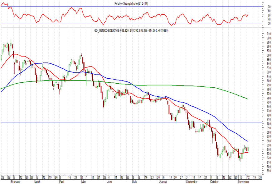 Και κυρίως για να απομακρυνθεί το σενάριο της απώλειας των 600 – 610 μονάδων ….. Και γενικά μετά και τη χθεσινή άνοδο, όλα τα βλέμματα στρέφονται στις ισχυρές αντιστάσεις στις 640 – 650 μονάδες (κλείσιμο στις 644 μονάδες, +1,39%). Για πολλοστή φορά λοιπόν τις τελευταίες εβδομάδες, η αγορά προσπαθεί να διασπάσει αυτές τις τόσο ισχυρές αντιστάσεις, με επόμενο στόχο σε αυτό το σενάριο τις αντιστάσεις στις 660 – 665 και 700 μονάδες ακόμη υψηλότερα. Και πάνω από όλα το καλό αυτό σενάριο θα απομακρύνει το εφιαλτικό σενάριο της απώλειας των 600 - 610 μονάδων, το οποίο θα οδηγήσει την αγορά  σε ένα νέο πτωτικό trend, τουλάχιστον μέχρι τις στηρίξεις στις 540 – 550 μονάδες.