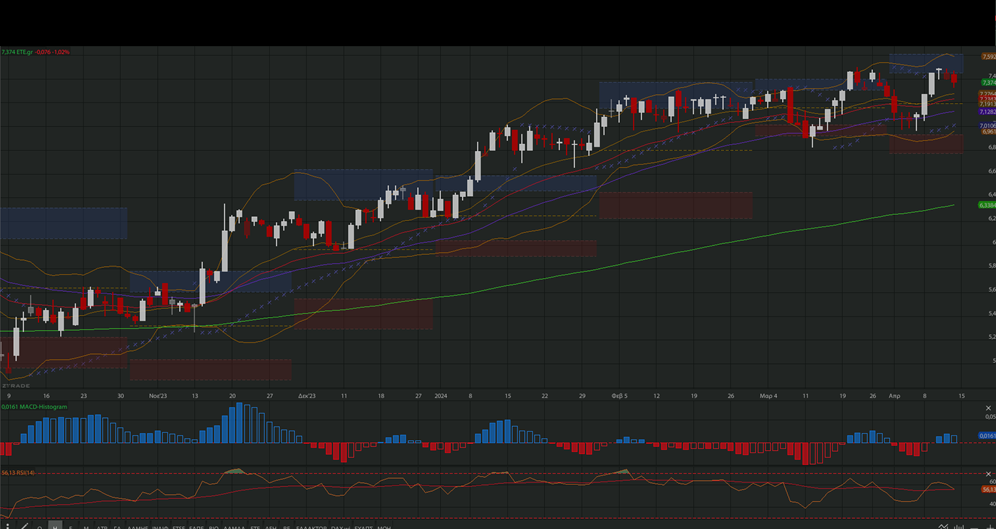 ΕΤΕ, με κλείσιμο την Παρασκευή στα 7,374 ευρώ, -1,02%.