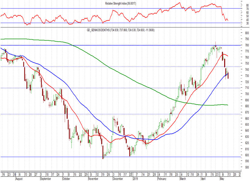Εμείς θα επαναλάβουμε πως είναι σημαντικό ο ΓΔ να μείνει υψηλότερα των προαναφερθέντων στηρίξεων (725 – 730 μονάδων) έτσι ώστε να αποφευχθεί μια πτώση μέχρι τις καθοριστικές στηρίξεις στις 700 – 710 μονάδες, οι οποίες είναι πολύ σημαντικό να μη χαθούνε κατά τις επόμενες εβδομάδες. Και από άποψης τεχνικής ανάλυσης, δεν αποκλείεται αυτή η παλινδρόμηση της αγοράς κοντά στα τρέχοντα επίπεδα των 725 – 730 μονάδων να συνεχιστεί.