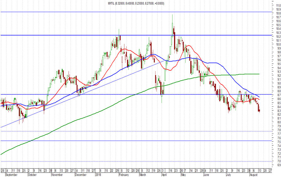 Παρόμοια κακή εικόνα, τόσο χθες όσο και κατά τις τελευταίες ημέρες και για τη μετοχή του Μυτιληναίου (8,00 ευρώ, -3,26%), με τη μετοχή να καταγράφει 6 σερί πτωτικές συνεδριάσεις, με απώλειες 24% από τα υψηλά στις 19/04 και τα 10,54 ευρώ. Τεχνικά και εδώ υπάρχει μια μεγάλη διαγραμματική επιδείνωση, με μεγάλες πιθανότητες η πτώση να συνεχιστεί, εφόσον δεν έχουμε άμεσα μια ισχυρή αντίδραση. Αναφορικά με τις επόμενες στηρίξεις, αυτές είναι στα 7,80 – 7,85 ευρώ και ακόμη χαμηλότερα στα επίπεδα των 7,10 – 7,20 ευρώ. Τώρα αν θέλουμε να μιλήσουμε για ουσιαστική βελτίωση της εικόνας, απαιτείται μια πολύ ισχυρή αντίδραση και επιστροφή της μετοχής υψηλότερα των 8,50 - 8,60 ευρώ.