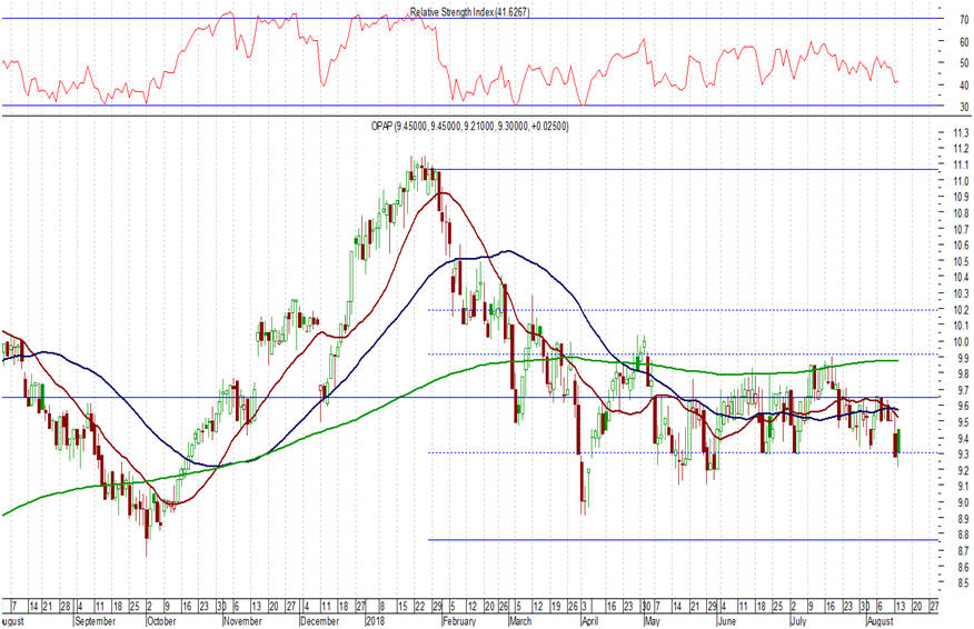 Ενόψει και της αναδιάρθρωσης μιας σειράς δεικτών (και σταθμίσεων που επηρεάζει συνολικά το Χ.Α. – είναι φυσικά και γενικά αρνητικό το κλίμα στις αγορές & το Χ.Α.) μια νέα κακή συνεδρίαση είχε χθες ο ΟΠΑΠ, σε συνέχεια της πρόσφατης πτώσης και με τη διαγραμματική εικόνα της μετοχής να έχει επιβαρυνθεί. Η μετοχή λοιπόν έκλεισε στα 9,055 ευρώ (-2,63%), με αγωνία να υπάρξει άμεσα αντίδραση και επιστροφή υψηλότερα των 9,50 – 9,60 ευρώ. Σε διαφορετική περίπτωση και μετά από απώλεια των στηρίξεων στα επίπεδα των 8,90 – 9,00 ευρώ (πλέον δοκιμάζονται), η διαγραμματική εικόνα θα επιδεινωθεί ακόμη περισσότερο, με κίνδυνο πτώσης ακόμη χαμηλότερα και μέχρι τουλάχιστον τις στηρίξεις στα επίπεδα των 8,50 – 8,60 ευρώ.