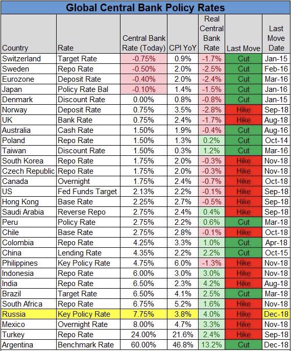 Και θα κλείσουμε με ένα ενδιαφέρον στατιστικό. Στον παρακάτω πίνακα παρουσιάζονται τα επιτόκια των βασικότερων κεντρικών τραπεζών ανά τον κόσμο. Όπως φαίνεται, με το μεγαλύτερο επιτόκιο η Τουρκία και η Αργεντινή.