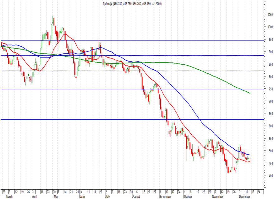 Και όσον αφορά την πορεία της αγοράς κατά το προσεχές διάστημα, θα σταθούμε στη διαγραμματική εικόνα του τραπεζικού δείκτη και την ανάγκη ο δείκτης να παραμείνει υψηλότερα των 450 – 460 μονάδων (έκλεισε την Παρασκευή στις 465,16 μονάδες, -0,88%). Όπως είχε σημειωθεί και στη στήλη «Κυνηγός» σε αναλυτικό σχόλιο την προηγούμενη εβδομάδα. Επιστροφή και σταθεροποίηση του δείκτη χαμηλότερα αυτών των επιπέδων, θα επανέφερε πλήρως τη μιζέρια με κίνδυνο πτώσης των τραπεζών τουλάχιστον μέχρι τις 410 – 415 μονάδες (χωρίς να μπορούν να αποκλειστούν ακόμη χαμηλότερα επίπεδα).