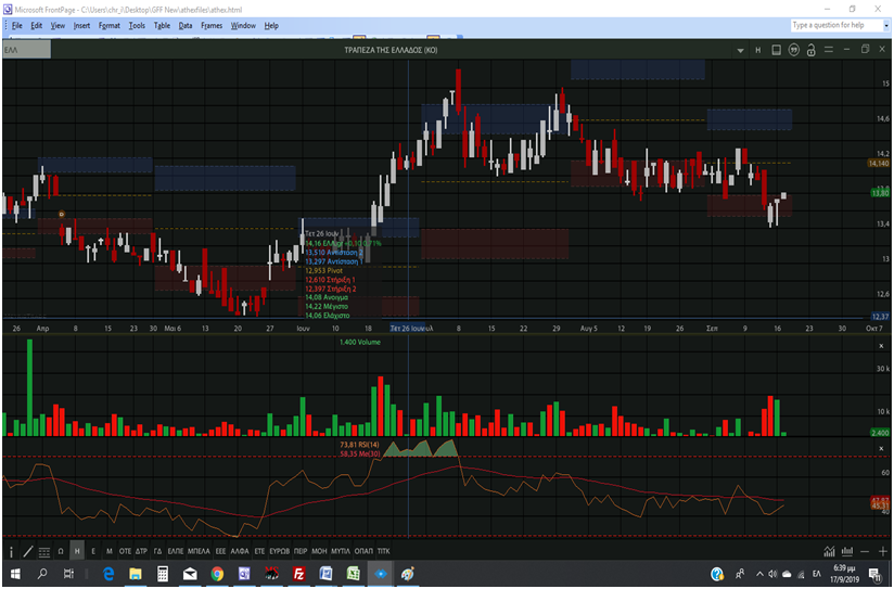Για ακόμη μια φορά τις προηγούμενες ημέρες η μετοχή της Ελλάδος. Η οποία αν και ιδιαίτερη περίπτωση, θεωρούμε πως αξίζει να βρίσκεται σε υψηλότερες αποτιμήσεις (περίπου 16 ευρώ η μετοχή). Κόλλησε στις ισχυρές αντιστάσεις στα επίπεδα των 14,00 – 14,20 ευρώ. Και ο στόχος είναι διπλός. Να μη χαθούνε σε καμία περίπτωση οι στηρίξεις στα επίπεδα των 13,30 – 13,40 ευρώ. Και παράλληλα η μετοχή να προσεγγίσει και πάλι και να διασπάσει την επόμενη φορά τις ισχυρές αντιστάσεις στα επίπεδα των 14,00 – 14,20 και 14,40 ευρώ. Μια διάσπαση η οποία όπως έχουμε γράψει θα ανοίξει το δρόμο για αισθητά υψηλότερα επίπεδα.