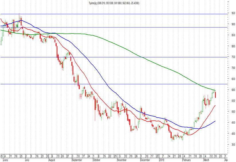 Και σε σχέση με τα όσα σημειώνονται στη στήλη Κυνηγός, θα τονίσουμε και εμείς πως μόνο ως φυσιολογική χαρακτηρίζεται η πρόσφατη διόρθωση της αγοράς. Αξίζει απλώς να αναφέρουμε κάτι. Ότι πέραν των αντιστάσεων του τραπεζικού δείκτη στις 600 μονάδες, οι οποίες δοκιμάστηκαν και ήλθε το χθεσινό -4,33% του τραπεζικού δείκτη. Κατά τις τελευταίες ημέρες και μετά από περίπου 8 – 9 μήνες, όλες οι τραπεζικές μετοχές βρέθηκαν, ακριβώς, στα όρια του ΚΜΟ 200 ημερών. Και μετά από ένα ομολογουμένως εντυπωσιακό ράλι από τα χαμηλά. Μια επιμέρους κατοχύρωση κερδών είναι ότι πιο φυσιολογικό, με σημείο αναφοράς τις 540 – 550 μονάδες του τραπεζικού δείκτη.