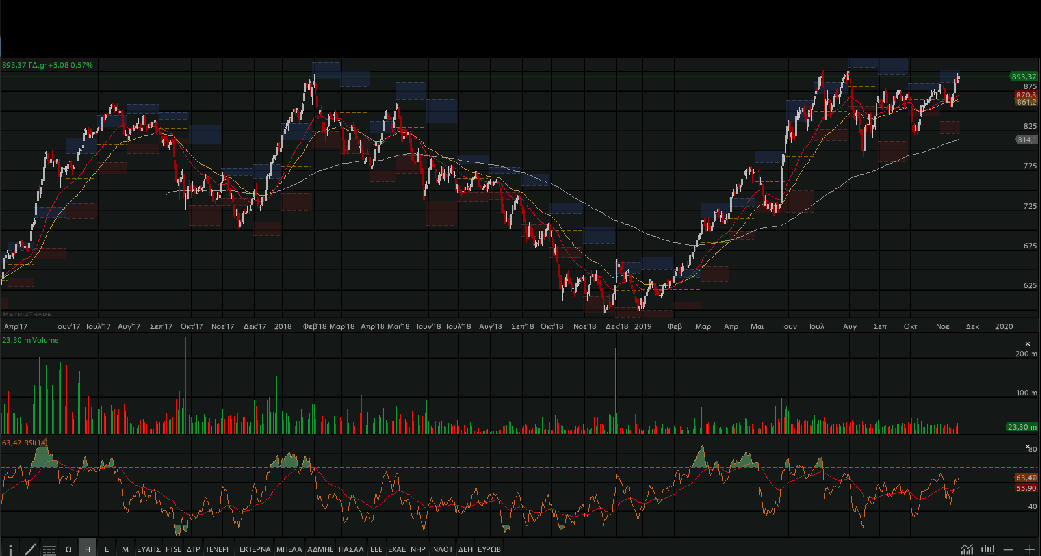Με νέα άνοδο έκλεισε χθες το Χ.Α., στις 893,37 μονάδες, +0,57%. Και όλα δείχνουνε πως η «μάχη» με τον «τοίχο» των 890 – 900 μονάδων θα συνεχιστεί. Δεν ξέρουμε αν θα τα καταφέρει αυτή τη φορά η αγορά. Ή θα συμβεί ότι και τις προηγούμενες φορές κατά τους τελευταίους μήνες. Και μετά τη δοκιμασία των αντιστάσεων θα έχουμε γύρισμα των τιμών. Ωστόσο θέλουμε να ελπίζουμε (δίνουμε 60-40%) ότι αυτή τη φορά θα συμβεί και η αγορά θα εισέλθει σε ένα νέο ανοδικό trend, που θα την φέρει σε επίπεδα υψηλότερα των 1.000 μονάδων (όπως συνεχώς σχολιάζουμε στο www.greekfinanceforum.com).