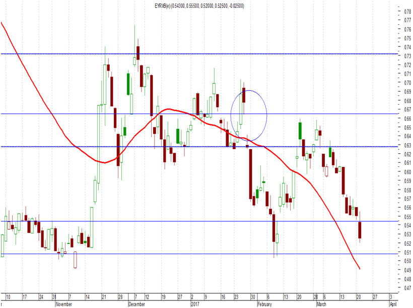 των 0,543 – 0,544 ευρώ (κλείσιμο 0,525 ευρώ, -4,55%), μια
