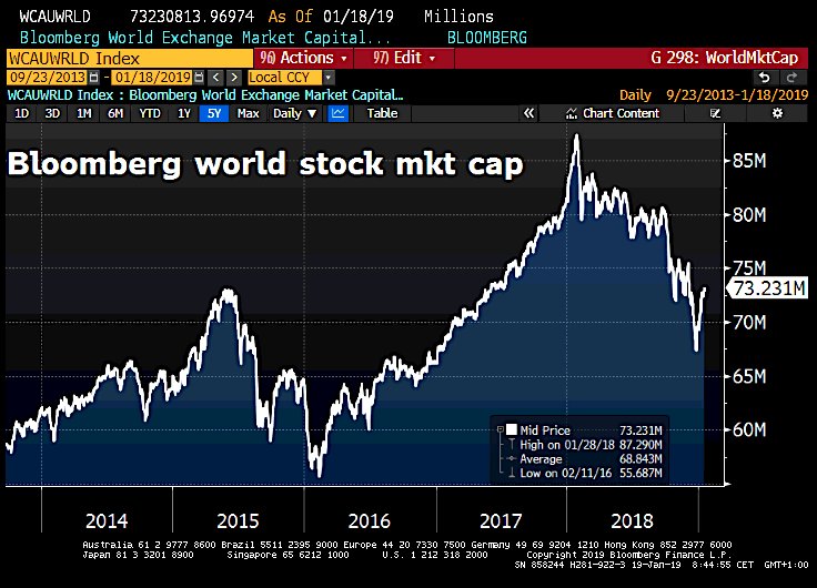 Και κλείνοντας με ένα σχόλιο για τα παγκόσμια χρηματιστήρια, όπου έχουμε ένα εξαιρετικά καλό ξεκίνημα, το οποίο ελπίζουμε να διατηρηθεί (τουλάχιστον βραχυπρόθεσμα) και να ωθήσει και το Χ.Α. υψηλότερα. Ας δούμε ένα ενδιαφέρον στατιστικό για την προηγούμενη καλή εβδομάδα. Κατά τη διάρκεια της λοιπόν τα διεθνή χρηματιστήρια κέρδισαν (συνολική κεφαλαιοποίηση όλων των χρηματιστηρίων) 1τρις δολάρια, με την συνολική κεφαλαιοποίηση να διαμορφώνεται πλέον στα 73,2τρις δολάρια. Για την ιστορία να θυμίσουμε πως από το ιστορικό υψηλό στις 28/01/18 (δηλαδή πριν από ένα χρόνο), οι απώλειες διαμορφώνονται στο 16% ή 14τρις δολάρια.