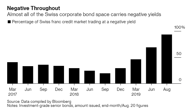 Και να κλείσουμε με ένα ενδιαφέρον στατιστικό από την παγκόσμια οικονομία. Ένα στατιστικό από την Ελβετία. Ένα στατικό το οποίο, όπως είχαμε γράψει και την Παρασκευή με αφορμή το σχόλιο για τα ιρλανδικά ομόλογα, πως κάτι δεν πάει καλά στην παγκόσμια οικονομία. Με πλεονάζουσα ρευστότητα που δεν ξέρει που να επενδύσει, εν μέσω ενός παγκόσμιου slow down. Είναι λοιπόν εντυπωσιακό πως το 94% των κύριων εταιρικών ομολόγων έχουνε αρνητικές αποδόσεις!!! Και επαναλαμβάνουμε πως μιλάμε για εταιρικές εκδόσεις και όχι ομόλογα χωρών.