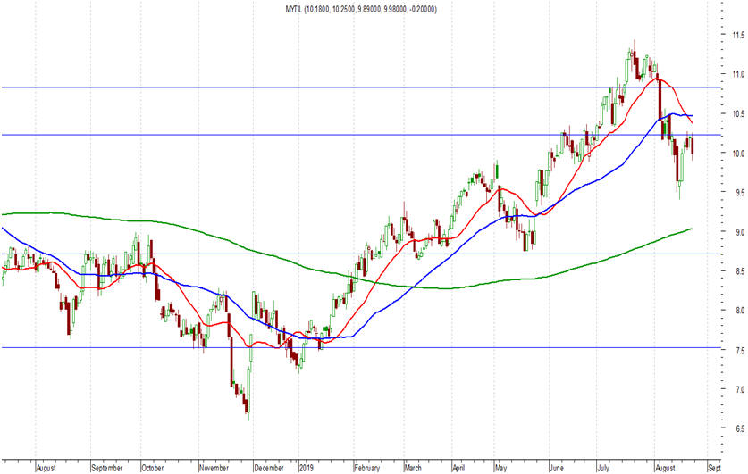 Στα 9,98 ευρώ (-1,96%) έκλεισε την Παρασκευή ο Μυτιληναίος. Και αν υπάρχει ένα ζητούμενο στην προσπάθεια να βελτιωθεί η διαγραμματική εικόνα. Είναι να διασπαστούν οι αντιστάσεις στα 10,40 – 10,50 ευρώ. Όσο η μετοχή μένει χαμηλότερα, η διαγραμματική εικόνα παραμένει οριακή. Και υπάρχει κίνδυνος να έχουμε εκ νέου υποχώρηση της τιμής, μέχρι τις ισχυρές στηρίξεις και πρόσφατα χαμηλά. Στα 9,20 – 9,30 ή και 9,00 ευρώ, όπου υπάρχει και ο ΑΚΜΟ 200 ημερών.