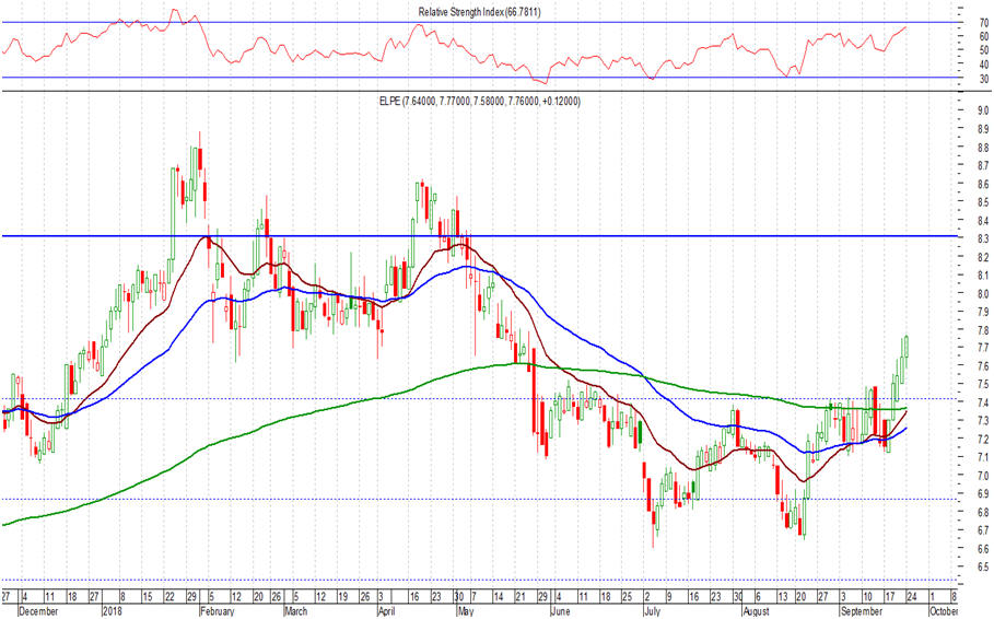 Στα 7,83 ευρώ (+0,90%) έκλεισαν χθες τα ΕΛΠΕ, με τη μετοχή κατά το τελευταίο χρονικό διάστημα να έχει μια εξαιρετική εικόνα, κόντρα στη συνολική μιζέρια της αγοράς. Είναι χαρακτηριστικό πως από τις 22/08 καταγράφεται άνοδος 17%, με τη διαγραμματική εικόνα να είναι  πλήρως θετική (διαγραμματικά - από τις καλύτερες μετοχές του FTSE 25  μαζί με την Motor Oil). Και πλέον με βασική προϋπόθεση την παραμονή υψηλότερα των 7,30 – 7,40 ευρώ, ο στόχος για τη μετοχή είναι οι αντιστάσεις στα επίπεδα των 8,30 και 8,50 – 8,60 ευρώ.