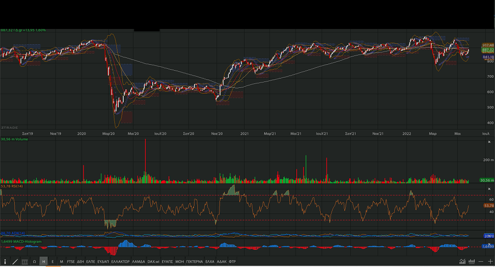 πρώτες πολύ ισχυρές αντιστάσεις (887,32 μονάδες, +1,60%).