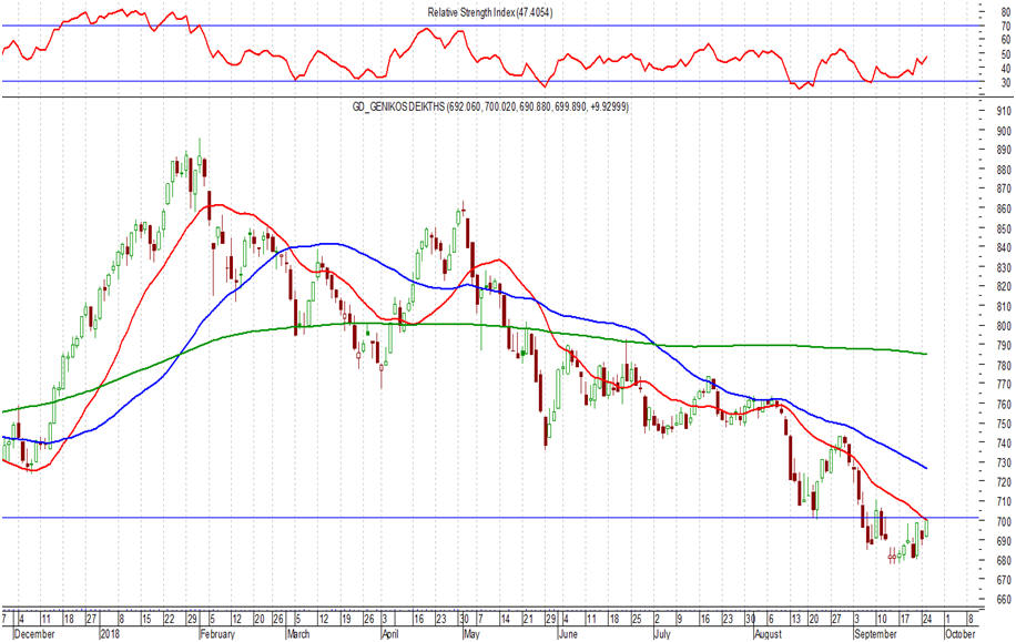 Ξεκινώντας με ένα γενικό σχόλιο για αυτό που λέγεται ελληνικό χρηματιστήριο, το οποίο χωρίς υπερβολή θα λέγαμε πως βρίσκεται σε μια από τις χειρότερες φάσης απαξίωσης των τελευταίων μηνών (για να μην πούμε ετών). Ως πρώτος στόχος για το Χ.Α. θα παραμείνει η επιστροφή του ΓΔ υψηλότερα των 700 – 710 μονάδων (είχαμε χθες ένα πρώτο κλείσιμο οριακά υψηλότερα των 700 μονάδων, στις 701,89 μονάδες). Και πέραν του ΓΔ, να σημειωθεί πως πολύ σημαντικό είναι και ο FTSE 25 να επιστρέψει υψηλότερα των 1.840 – 1.850 μονάδων, με χθεσινό κλείσιμο τις 1.843,95 μονάδες (+0,52%). Σημειώνεται πως μια τέτοια διπλή διάσπαση των δύο δεικτών, θα μας έκανε μετά από καιρό να μιλήσουμε για μια σημαντική βελτίωση της διαγραμματικής εικόνας της αγοράς. Και το γεγονός ότι οι δύο δείκτες βρίσκονται στα όρια κρίσιμων επιπέδων καθιστά τις επόμενες συνεδριάσεις ενδιαφέρουσες (όσο αυτό μπορεί να το πει κανείς για το ελληνικό χρηματιστήριο, ειδικά όπως είναι τον τελευταίο καιρό).
