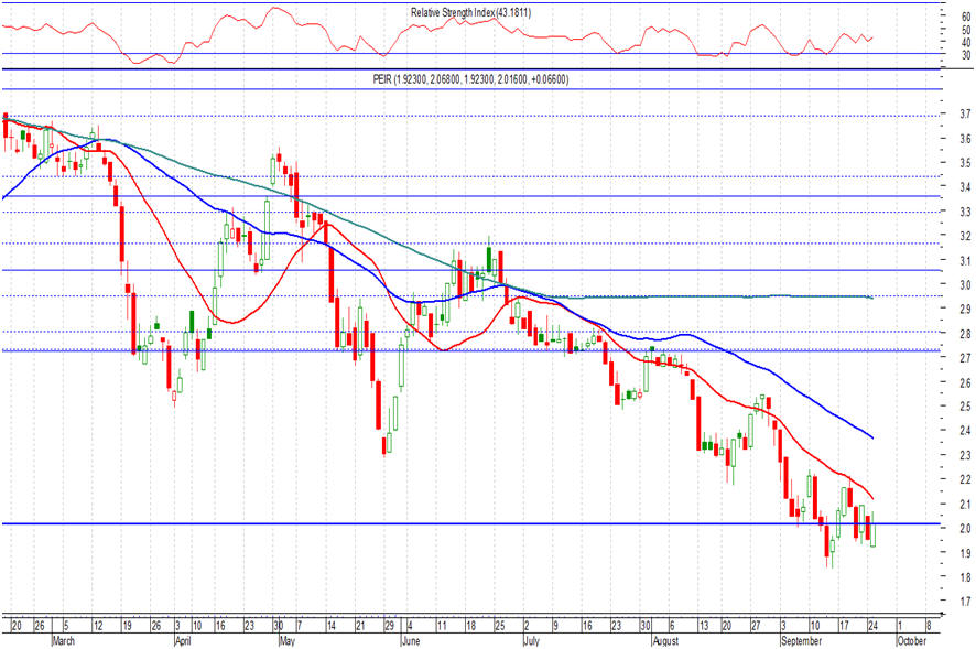 Στα 2,03 ευρώ (-0,30%) έκλεισε χθες η μετοχή της Τράπεζα Πειραιώς, ελπίζοντας πως επιτέλους θα έχουμε μια πρώτη υπέρβαση κατά τις επόμενες ημέρες. Τόσο σε όλη την αγορά (και ειδικά τις τραπεζικές μετοχές), όσο και από την Πειραιώς. Ο πρώτος λοιπόν στόχος αν θέλουμε να μιλήσουμε για μια πρώτη βελτίωση της εικόνας της μετοχής είναι η διάσπαση των ισχυρών αντιστάσεων στα 2,11 – 2,12 ευρώ. Μια πρώτη τέτοια διάσπαση θα ήταν ένα πρώτο, σημαντικό, βήμα με επόμενο στόχο τις αντιστάσεις στα επίπεδα των 2,35 – 2,37 ευρώ. Τώρα διάσπαση και αυτών των αντιστάσεων θα μπορούσε να οδηγήσει σε ένα ανοδικό trend μέχρι τα επίπεδα των 2,93 – 2,95 ευρώ, ένα σενάριο κατά το οποίο θα μιλούσαμε για νέα δεδομένα.