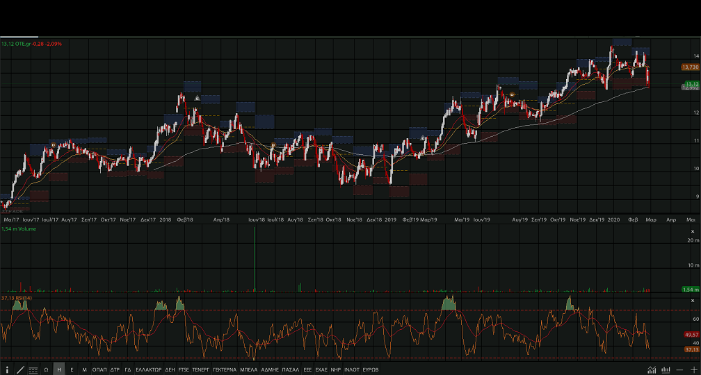 ΟΤΕ, με κλείσιμο στα 13,12 ευρώ, -2,09%. Σημειώνεται πως το