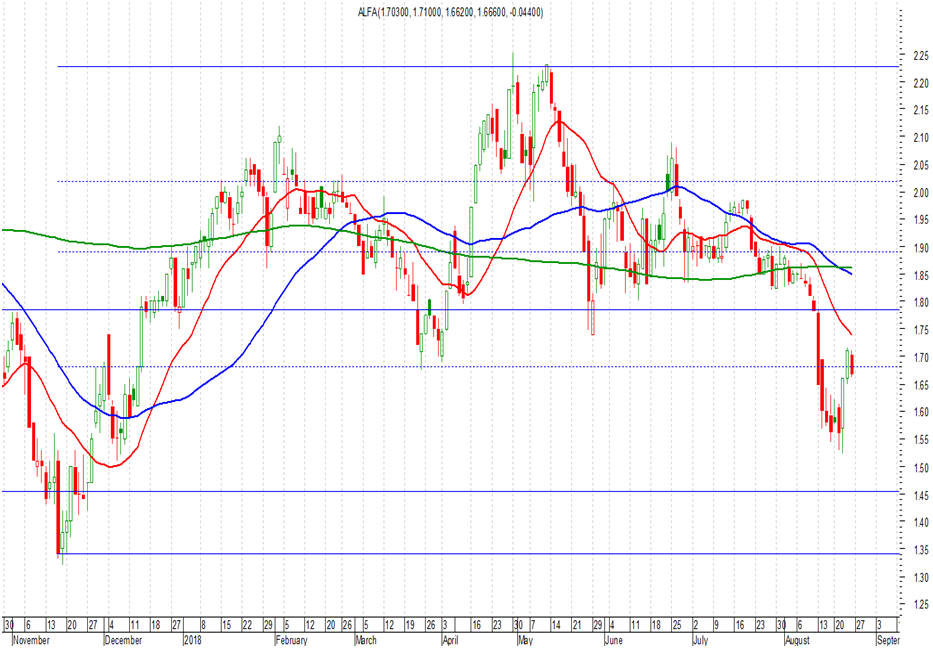 Στα 1,713 ευρώ (+2,82%) έκλεισε η μετοχή της Alpha Bank, με τη διαγραμματική εικόνα να είναι αρνητική και ένα πρώτο ζητούμενο να είναι η επιστροφή υψηλότερα των 1,74 – 1,75 ευρώ. Αυτό θα είναι ένα πρώτο βήμα να μιλήσουμε για βελτίωση της εικόνας. Υψηλότερα, ο επόμενος μεγάλος στόχος είναι οι αντιστάσεις στα επίπεδα των 1,85 – 1,87 ευρώ. Μόνο μετά από μια τέτοια επιστροφή μπορούμε να μιλήσουμε για πλήρης βελτίωση της διαγραμματικής εικόνας με προοπτικές να μιλήσουμε για ακόμη υψηλότερα επίπεδα και επίπεδα υψηλότερα των 2,00 ευρώ.