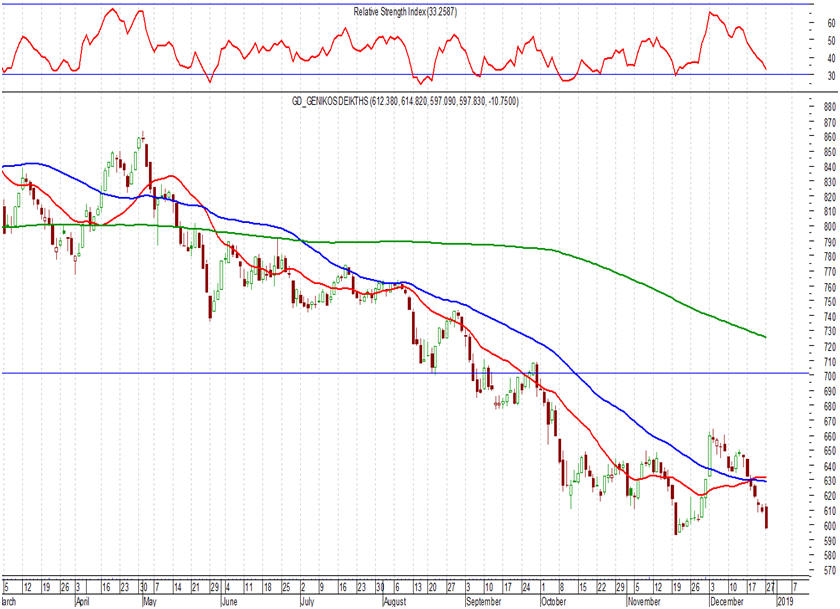 Επαναλαμβάνουμε πάντως πως η κατάσταση στο Χ.Α. μετά και το τελευταίο 7 στα 7 είναι αρκετά σοβαρή. Και αν και κουραστικό, θα το επαναλάβουμε και σήμερα. Οριστική απώλεια των 600 μονάδων, βάζει την αγορά σε ένα νέο πτωτικό trend, με κίνδυνο πτώσης τουλάχιστον μέχρι τις 540 – 550 μονάδες, χωρίς να αποκλείονται ακόμη χαμηλότερα επίπεδα.