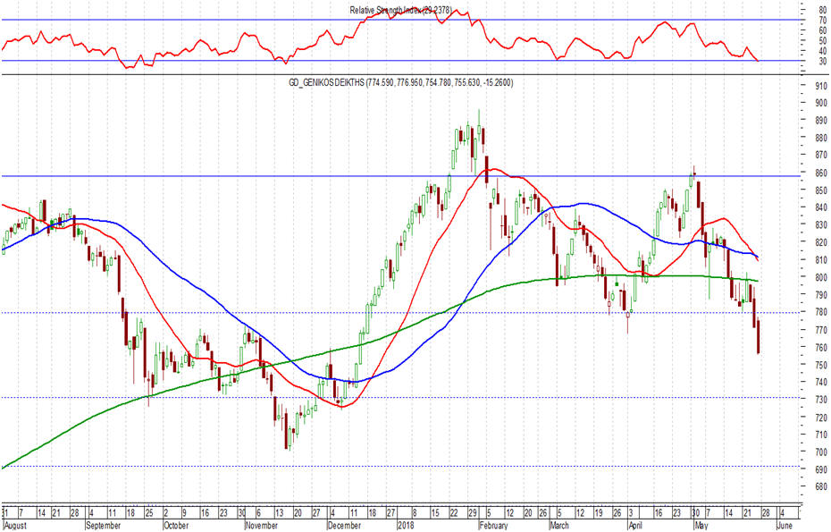 Το μόνο σίγουρο είναι πως θα είναι ενδιαφέρουσα χρηματιστηριακά εβδομάδα αυτή που ξεκινάει σήμερα, με φόντο την τελευταία πτώση των τιμών και με τη διαγραμματική εικόνας της αγοράς να έχει επιδεινωθεί πάρα πολύ με κίνδυνο η πτώση να επιταχυνθεί. Σε κάθε περίπτωση η επικαιρότητα από την υπόθεση της Folli Follie θα συνεχίσει να μας απασχολεί, ενώ μεθαύριο Πέμπτη 31/05 θα είναι και η τελευταία ημέρα για τις περιβόητες αλλαγές των δεικτών της Morgan Stanley (MSCI). Και φυσικά σε όλα αυτά προσθέτουμε μια ξαφνική αγωνία που υπάρχει για την κατάσταση στην Ιταλία, η οποία οδηγεί σε πιέσεις σε όλο το νότο και φυσικά τον πλέον ευαίσθητο κρίκο την Ελλάδα (χαρακτηριστικό είναι πως την Παρασκευή στο -2% ήταν και Ιταλία και Ισπανία – χθες πάντως οι αγορές ισορρόπησαν).