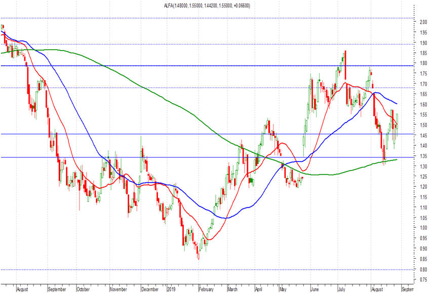 Στα 1,55 ευρώ (+4,45%) έκλεισε χθες η μετοχή της Alpha Bank, με διπλό στόχο από εδώ και πέρα. Αφενός την παραμονή της μετοχής υψηλότερα των 1,52 – 1,53 ευρώ. Και με βάση αυτήν την παραμονή, να έχουμε τη διάσπαση των αντιστάσεων στα επίπεδα των 1,60 – 1,61 ευρώ. Διάσπαση και αυτών των αντιστάσεων οδηγεί σε μεγάλη βελτίωση τη διαγραμματική εικόνα, με επόμενο στόχο σε αυτό το σενάριο τα υψηλά στα επίπεδα των 1,85 – 1,86 ευρώ.