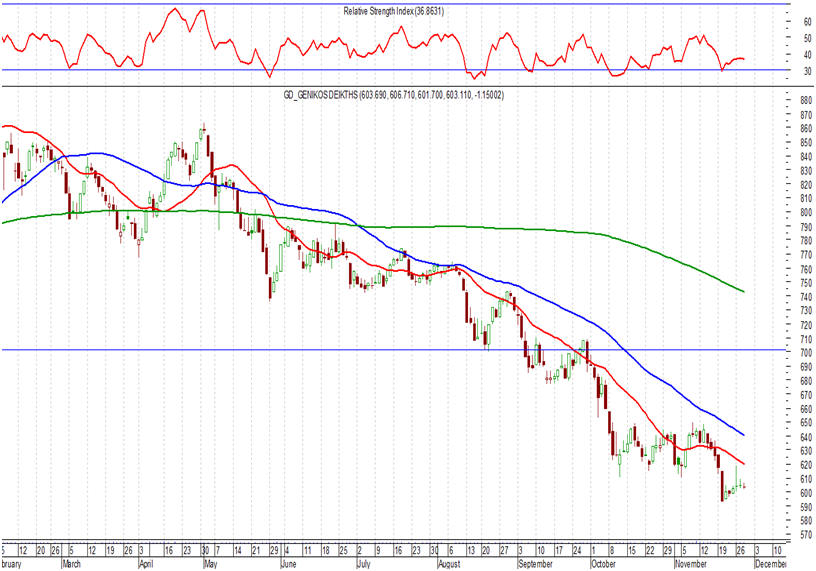 Πάντως όσον αφορά την κίνηση του ΓΔ αυτή καθ’ αυτή στις 600 – 610 μονάδες. Μια κίνηση η οποία δε μας εκπλήσσει. Και στο δρόμο φυσικά προς την αναδιάρθρωση των δεικτών ….. Θα επαναλάβουμε πως η ανησυχία μας έχει να κάνει με το ότι στα τρέχοντα επίπεδα των 600 – 610 μονάδων θα συμβεί αυτό που είχε συμβεί στις 700 – 710 μονάδων. Όταν δηλαδή η αγορά κινούνταν για περίπου 1 με 1,5 μήνα στα όρια τους. Αυτές οι στηρίξεις στο τέλος χάθηκαν και είδαμε μια γρήγορη διόρθωση 100 περίπου μονάδων (-14%), μέχρι τις τρέχουσες στηρίξεις στις 600 – 610 μονάδες.