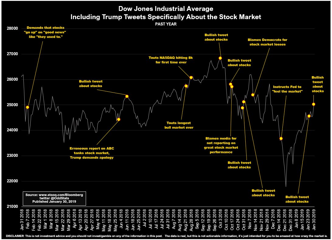 This is the Dow Jones Industrials chart for the past year (including today) with Trump tweets
