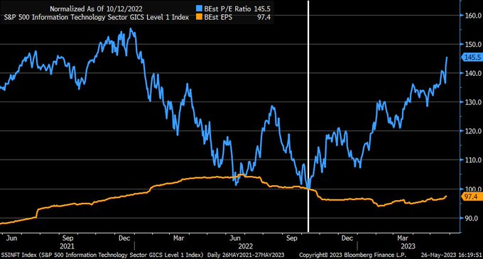 P/E (blue) has soared by nearly 46%, while forward EPS
