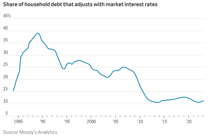 Only 11% of US household debt has an adjustable interest rate. That means the vast majority of Americans with existing fixed rate mortgages/auto loans/student loans have not been impacted by the Fed's 11 rate hikes.