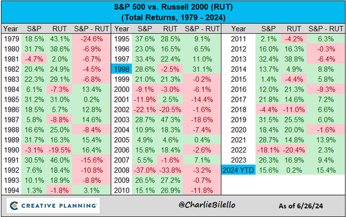 The large cap S&P 500 is outperforming the small cap Russell 2000 by more than 15% this year, the biggest outperformance we've seen since 1998.