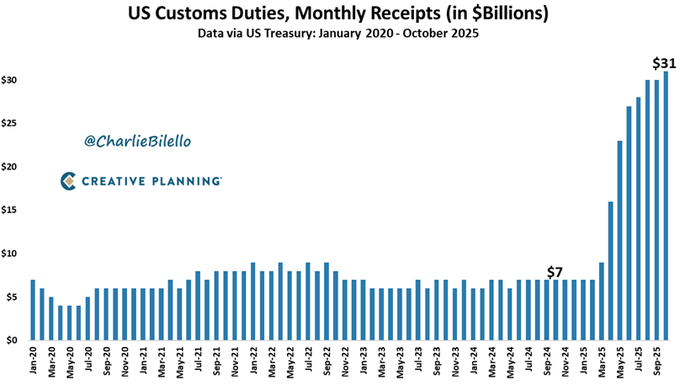 The US collected a record $31 billion in customs duties in October, which was over 4x higher than the same month in 2024